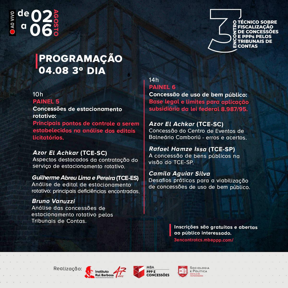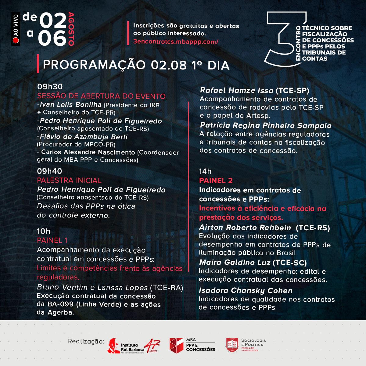 A mesa de abertura contará com a participação de Ivan Lelis Bonilha, Presidente do IRB e Conselheiro do TCE-PR; Pedro Henrique Poli de Figueiredo, Conselheiro aposentado do TCE-RS; Flávio de Azambuja Berti, Procurador do MPC-PR; e Carlos Alexandre Nascimento, Coordenador geral do MBA PPP e Concessões.
