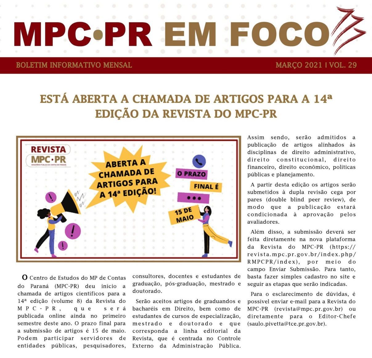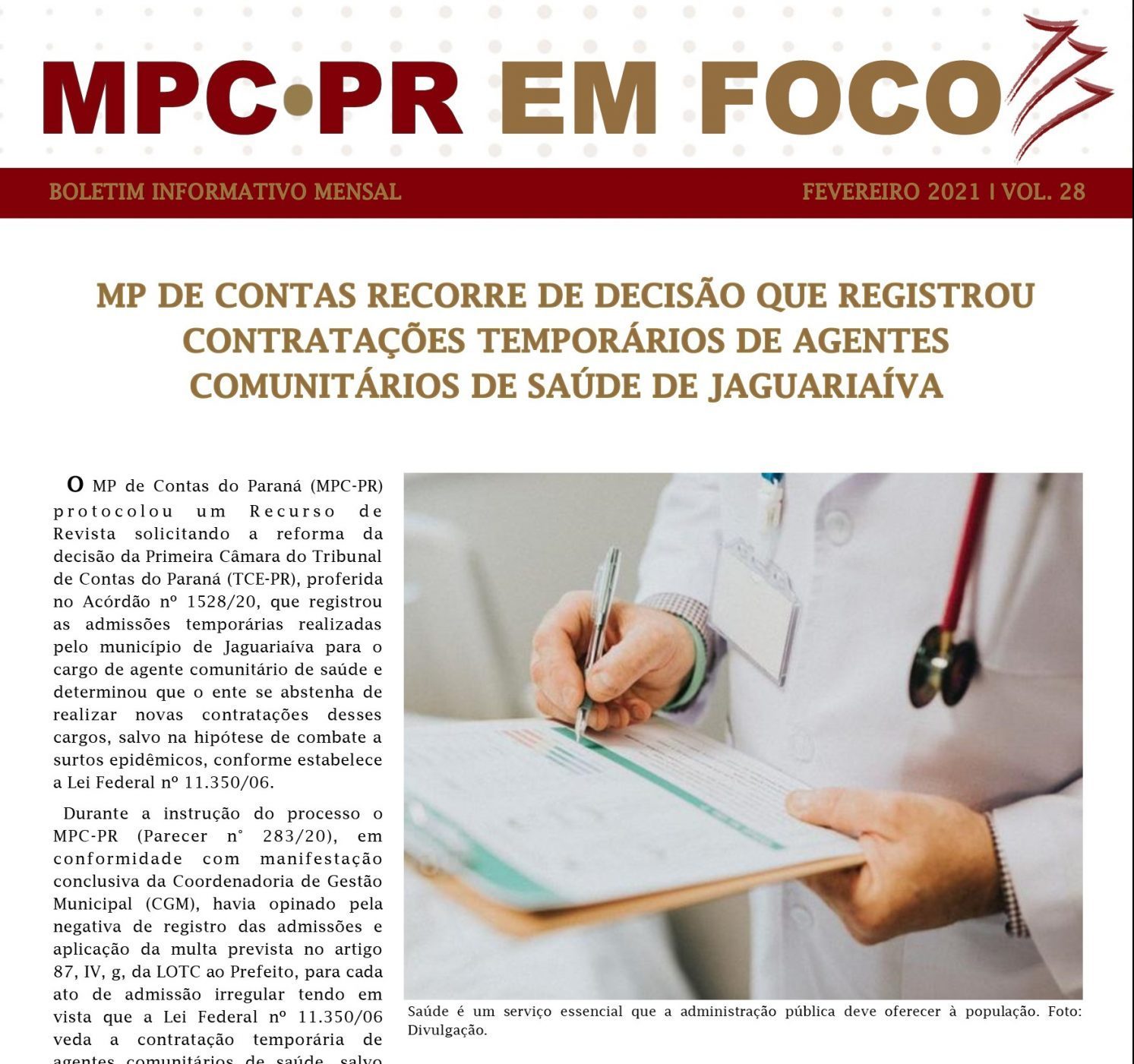 A edição do Boletim MPC-PR em Foco de janeiro traz em destaque as notícias: MPC-PR retoma atividades em regime de teletrabalho nesta segunda-feira (10); Contas…