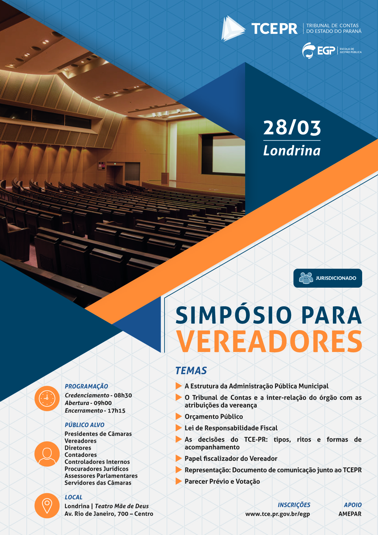 Em Londrina, seminário do TCE-PR para Vereadores discutirá questões importantes sobre o controle externo, como a estrutura da administração pública municipal, o orçamento público, a Lei de Responsabilidade Fiscal, os processos no Tribunal de Contas, entre outras.