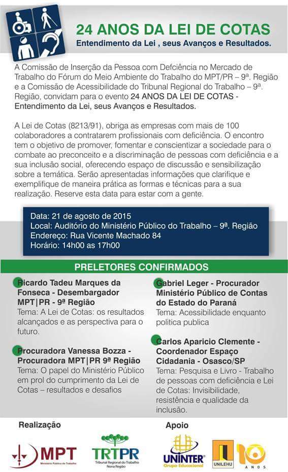 O seminário, promovido pela Comissão de Inserção da Pessoa com Defciência no Mercado de Trabalho do Fórum do Meio Ambiente do Trabalho do MPT/PR – 9ª. Região e a Comissão de Acessibilidade do Tribunal Regional do Trabalho – 9ª. Região, debate o marco legislativo da Lei de Cotas (8213/91), que obriga as empresas com mais de 100 colaboradores a contratarem profissionais com deficiência. O encontro tem o objetivo de promover, fomentar e conscientizar a sociedade para o combate ao preconceito e a discriminação de pessoas com deficiência e a sua inclusão social, oferecendo espaço de discussão e sensibilização sobre a temática. Serão apresentadas informações que clarifique e exemplifique de maneira prática as formas e técnicas para a sua realização.