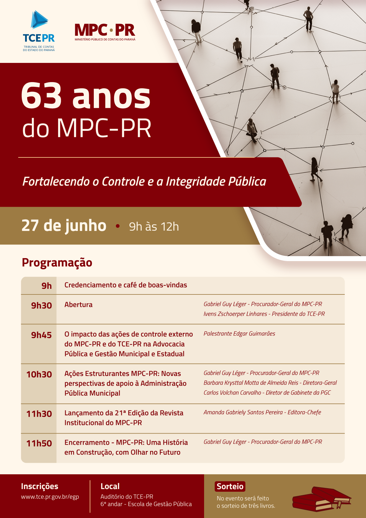 No dia 27 de junho (sexta-feira), o Ministério Público de Contas do Paraná (MPC-PR) completa 63 anos de atuação em defesa do interesse público, da boa governança e da efetividade das políticas públicas. Para celebrar a data, será realizado um evento comemorativo voltado exclusivamente ao público interno, reunindo membros, servidores e estagiários da instituição e do Tribunal de Contas do Estado (TCE-PR).