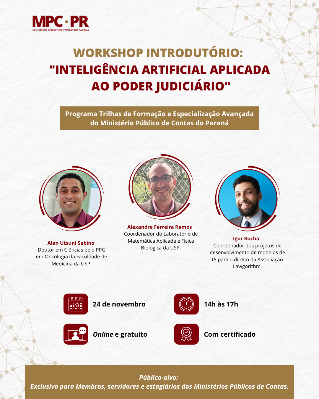 O Workshop Introdutório: “Inteligência Artificial Aplicada ao Poder Judiciário”, integra o programa Trilhas de Formação e Especialização Avançada do Ministério Público de Contas do Paraná. Estruturado em três áreas de conhecimento – Inteligência, Inovação e Inteligência Artificial e Transformação Digital –, a iniciativa tem como objetivo promover a capacitação e a atualização contínua dos profissionais que integram os Ministérios Públicos de Contas, preparando-os para os desafios contemporâneos no controle e fiscalização dos recursos públicos.